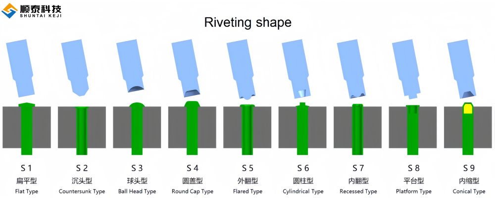 Our servo orbital riveting enables diverse shapes — including Flat, Countersunk, Ball Head, Flared, and Custom forms — to meet varied functional and space requirements. We provide standard shape options (S1–S9) and support tailored designs for precise, reliable, and space-efficient joints.