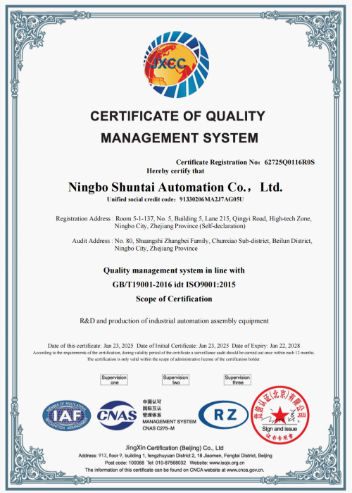 Ningbo Shuntai Automation Co., Ltd. originated from the Automation Division of Hongheng Precision. Since 2005, the company has dedicated itself to the R&D and manufacturing of automation technology, and began independent operation in 2015. As a National High-Tech Enterprise certified with ISO standards, the company boasts an R&D and management team with decades of industry experience, possessing profound technical expertise and exceptional project management capabilities. The company specializes in providing innovative and intelligent integrated automation and digital solutions for high-end electronics manufacturing, advanced semiconductor equipment, precision electronic components, and automotive parts. In the areas of rotary riveting and press riveting processes, we hold multiple core patents and software copyrights, continuously driving improvements in process precision and efficiency. Located in the Ningbo High-tech Zone, the company benefits from a strategic position close to Beilun Port, Ningbo Bonded Zone, and the Free Trade Zone, ensuring efficient logistics and a strong ability to respond swiftly to global market demands. Shuntai Automation is driven by R&D and committed to becoming a world-leading partner for high-end automation solutions.