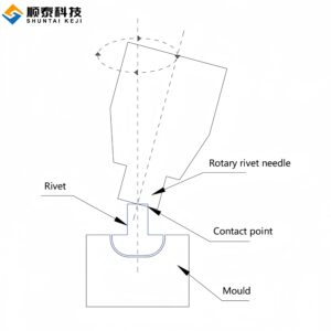 | This unique compound motion causes the contact point between the die (Mould in Diagram 1) and the rivet (River) to continuously vary, transforming the powerful axial force into a uniform, continuous radial material flow. Guided by the riveting needle (Rotary rivet needle) and constrained by the die cavity, the rivet material spreads evenly outward—akin to being “gently kneaded” rather than “forcibly upset.” This results in a reliable joint that is free of cracks, highly precise, and has a smooth finish, all achieved with minimal riveting force (only 10%-20% of traditional press riveting). | ![]() |