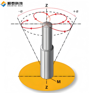 | Orbital riveting is an advanced cold-forming process. Its core lies in maintaining a precise tilt angle (α, typically 3°-8°) between the riveting spindle axis and the forming die axis. During operation, the riveting spindle does not press down vertically. Instead, it drives the die to perform a continuous 360° eccentric orbital movement (shown as the S trajectory in Diagram 2) while simultaneously feeding along the Z-axis. | ![]() |